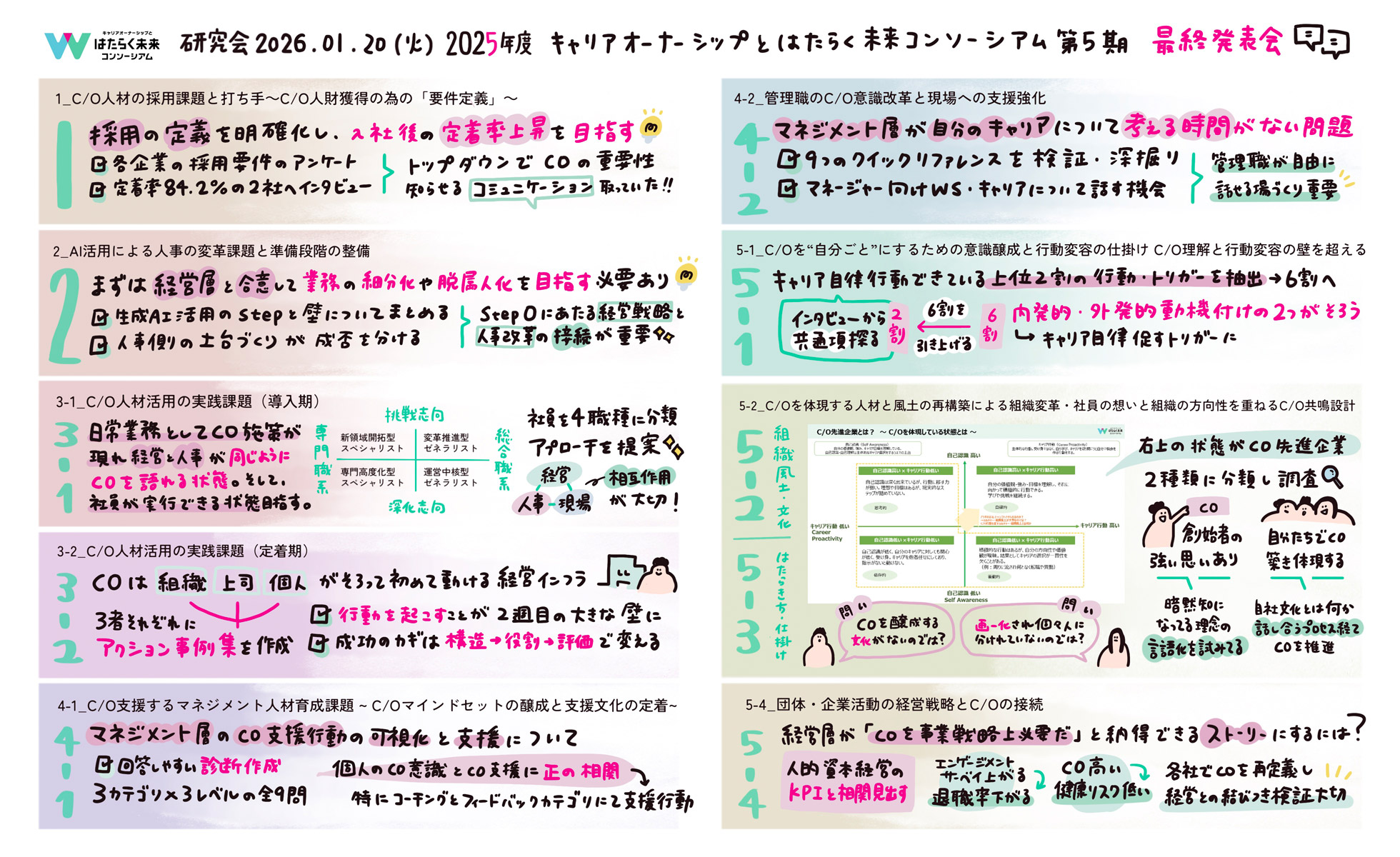 2026年1月20日、日本を代表する41社が集まり「キャリアオーナーシップとはたらく未来コンソーシアム 第5期」の最終発表を実施しました。第5期は「これまでの期で培った資産を活用して、キャリアオーナーシップ経営の先進事例を作る」べく、議論を深めました。各分科会の発表後、他の分科会の参加者がコメントを交わし、議論を深めました。
