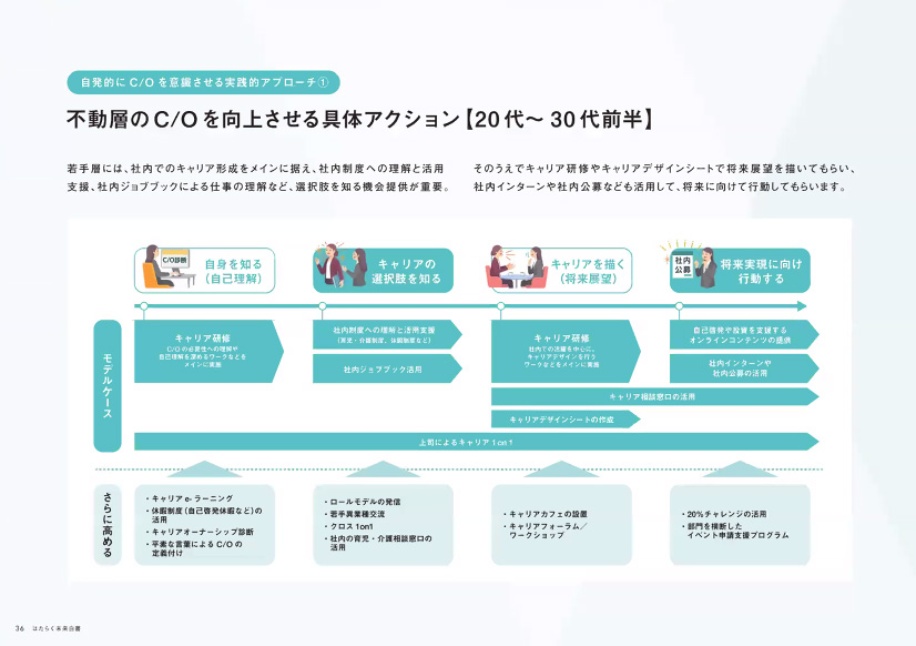 20代については、あまり不動層がいないため、いかに不動層になることを防ぐかが重要でした。特に、全員参加のキャリア研修を通じて自己を知り、キャリアを描いてもらうことが重要でした。また、社内副業や社内公募を経験してもらったり、スキルアップのツールを手配したりすることが重要でした。1on1でも、上司以外とのクロス1on1も効果があると分かりました。
