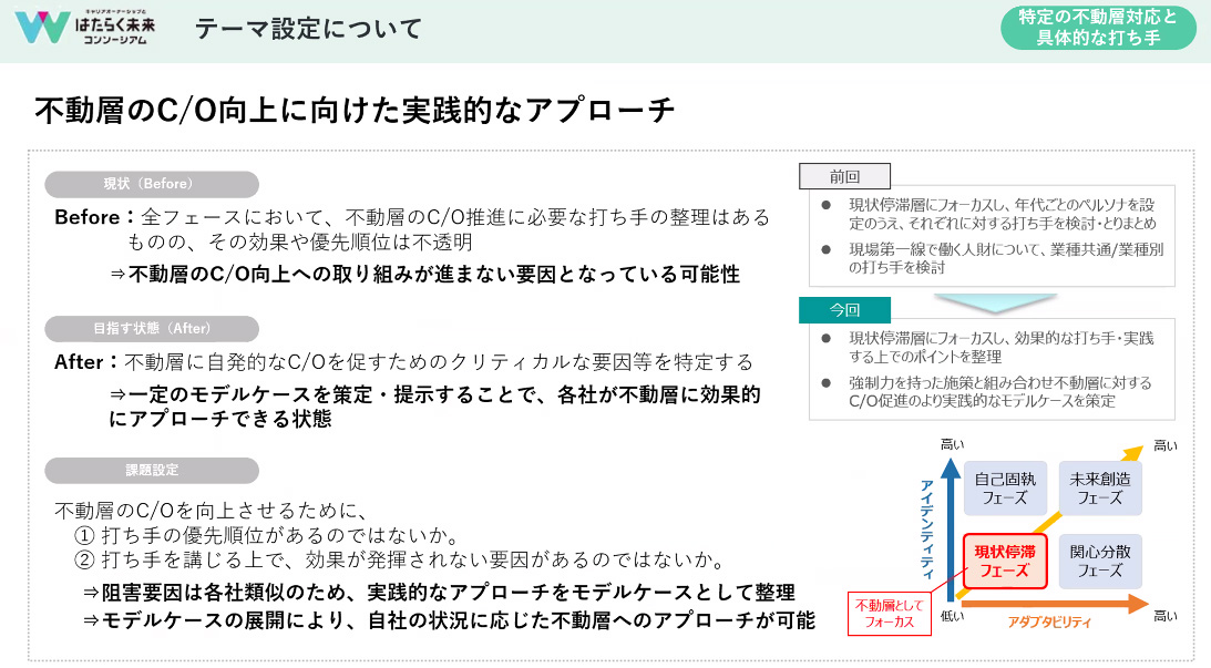 これまでキャリアオーナーシップについてコンソーシアムでの研究はなされてきましたが、やはり組織にはキャリアオーナーシップの意識が高い人と、そうでない人がいる。ここでは不動層と申し上げていますが、その層の活用が課題になります。不動層という言葉はあまり好きではなく、人事のアプローチが響かなかった方かなと考えております。