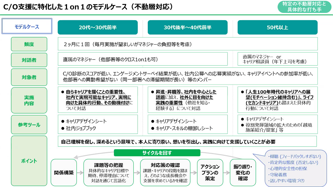 現状停滞フェーズに入る方々へのアプローチですね。20代から30代前半は社内向けのアプローチ、そして30代後半からは社外へ目を向けましょうという具体的なアドバイスでした。1on1のフォーカスポイントも書かれており、各社導入時のガイドブックになると思いました。ありがとうございます。