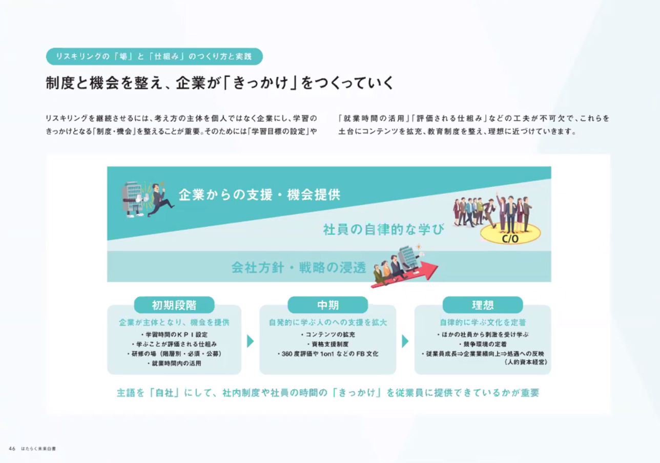 たとえば、初期段階は「学習時間〇時間」といったKPIを企業が設定するなどの施策がありえます。詳しくは白書に記しましたので、よろしくお願いいたします。