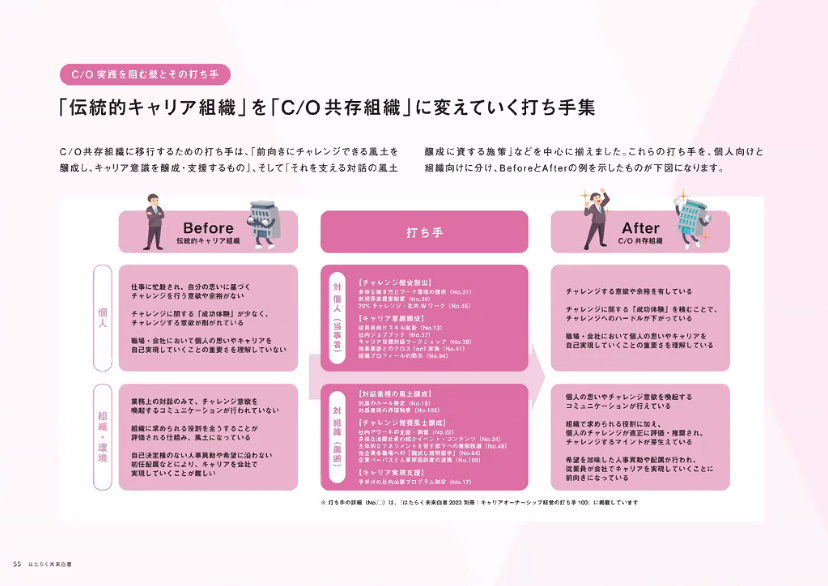このように、個人が自らの思いやチャレンジ意欲を持ち、それを喚起するようなコミュニケーションが行える組織。また、組織が求める役割を果たすだけでなく、個人のチャレンジが正当に評価・推奨されることで、チャレンジするマインドが自然と育まれていく組織への転換が可能になると考えています。