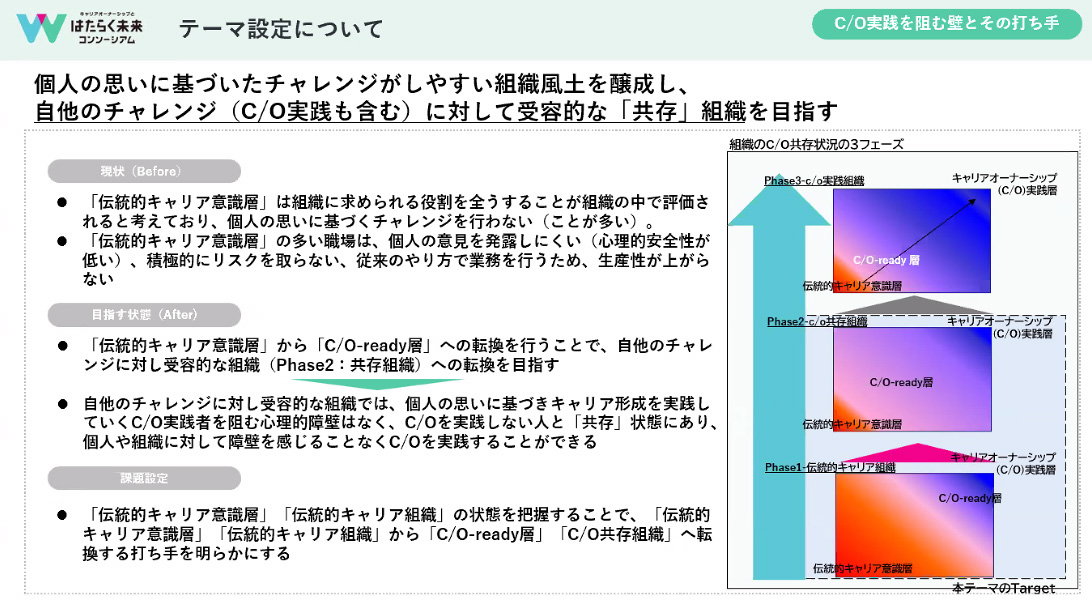 キャリアオーナーシップの重要性が増していることはみなさまもご存じかと思います。しかし、キャリアオーナーシップを持っていてもそれが実践できない壁があるのではないか、と考えてきました。しかし、なかには「非協力者」がいるのではないか。と、とらえました。二項対立にならないよう、タナケン先生からのアドバイスもあり「これまでの成長を支えてきた方々が、キャリアオーナーシップ経営の壁になっているのではないか」という仮説を立てています。