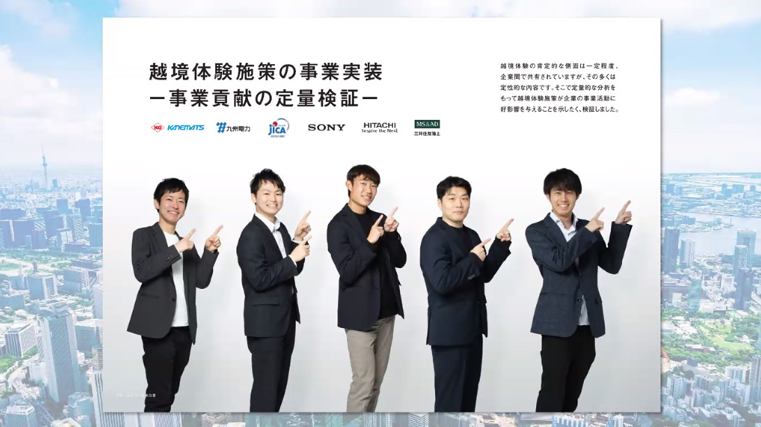 三井住友海上の新川です。越境体験については定性的な意見が多く、実際に有効なのか? という視点から導入が進まない、進んでも効能を説明できない課題がありました。そこで越境体験が事業貢献につながるストーリーを示し、それをデータで裏付けできるよう研究しました。