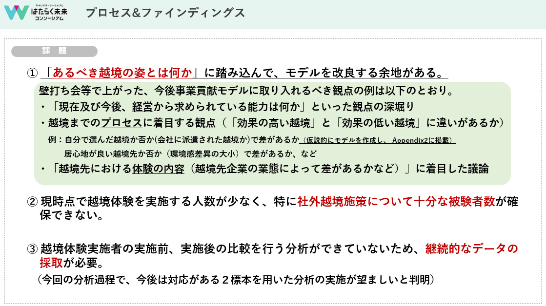 今回、定量・定性の分析を通じて一定の結論を導き出し、「事業貢献モデル」を分科会としてまとめることができました。しかし、課題もあります。1点目は、有識者とのディスカッションを通じて、「理想的な越境体験の在り方」について、さらに踏み込む余地がある点です。