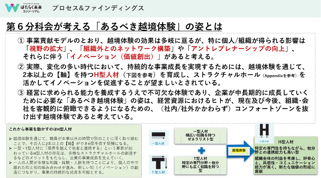 最後に、あくまでも仮説ですが、「あるべき越境体験の姿」について、分科会としてまとめました。「あるべき越境体験」として目指すのは、越境体験を通じてH型人材(複数の専門性やスキルを持ち、それを横断的に活用できる人材)を育成することです。