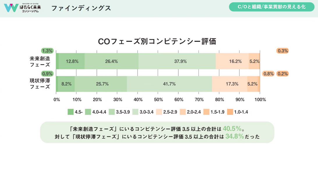 グラフのとおり、未来創造型のコンピテンシー評価(3.5以上)の割合が40.5%であるのに対し、現状維持型の評価は34.8%にとどまっていることが明らかになりました。