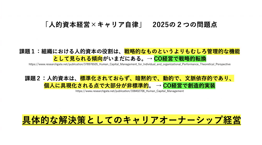 私たちが取り組んでいるのは、単なる「人的資本の開示」ではありません。コンソーシアムが重要視しているのは、キャリアオーナーシップ経営を導入し、意識改革、実装をどうするかを考えている。リスキリングの場や持続的成長の仕組みをどう作るのか。HR部門の在り方や組織構造をどう変えるのかといった、実践的なキャリア開発に焦点を当てています。