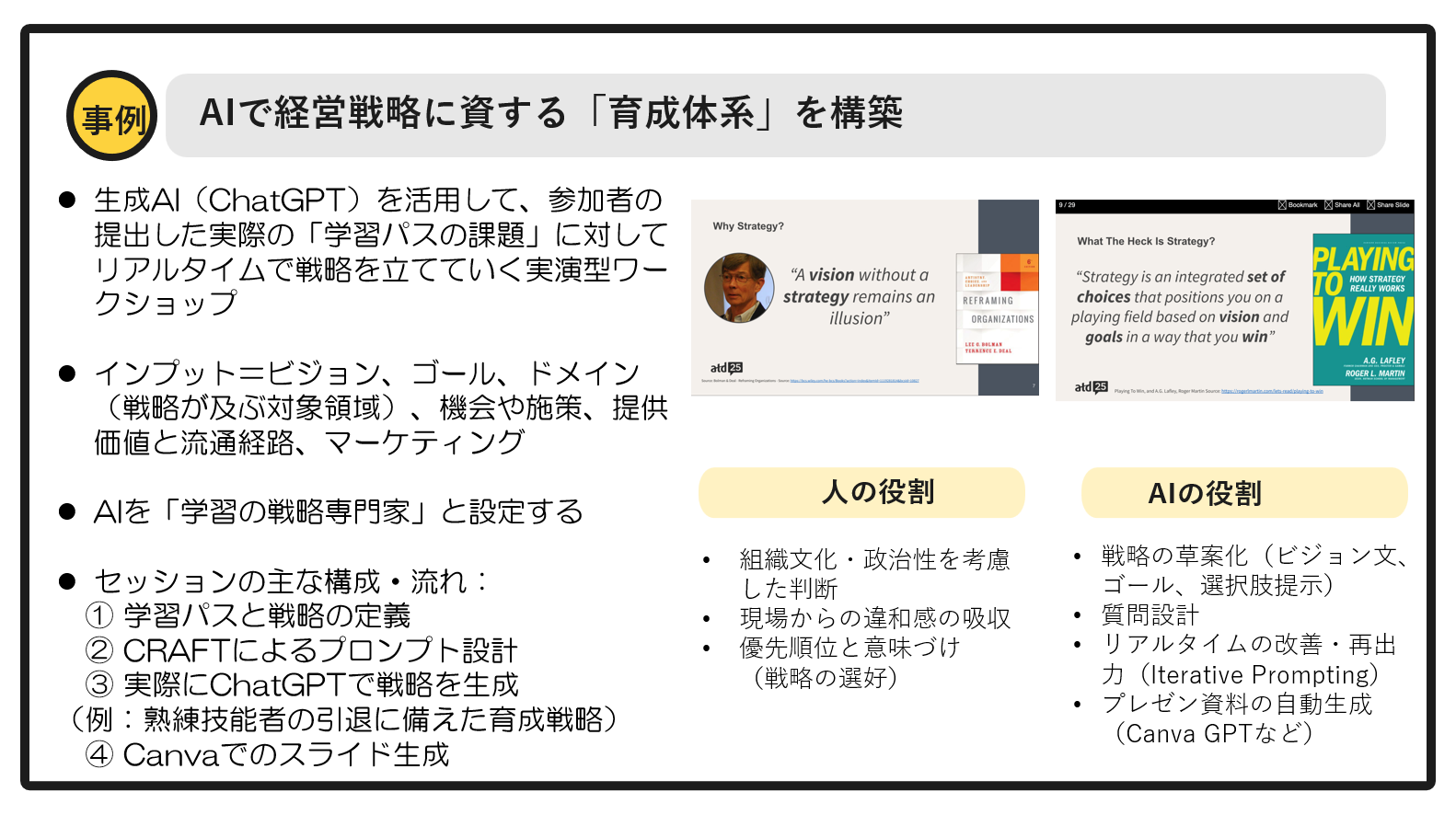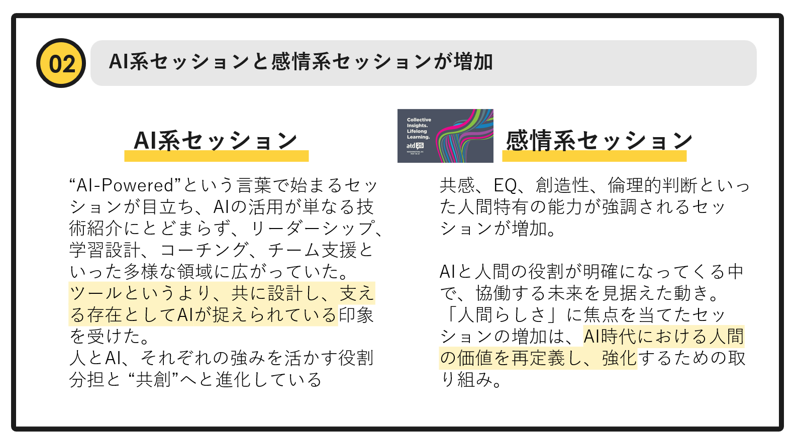 ATDは、世界中から人事や人材開発の専門家が集まる世界最大級の会議であり、約300ものセッションが繰り広げられます。もともとATDは、ラーニング(学習)について研究する場であり、AIに関するテーマは非常に少なかったのです。しかし、今年からAI関連のセッションが50以上も増え、古くから知る参加者からは『ATDも変わったね』という声が上がるほどでした。