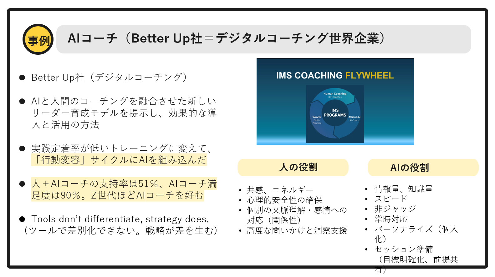 具体的な活用事例として、コーチングサービスを提供するベターアップ社の取り組みを紹介します。ベターアップ社では「AIコーチ」を導入しています。たとえば、AIへ企業のビジョンや事業ドメイン、現在の人材データを入力すると、今後育成すべき人材ポートフォリオや個人の学習パスが生成される。今までですと情報量や分析が膨大すぎて、人の手では難しかったんですよね。