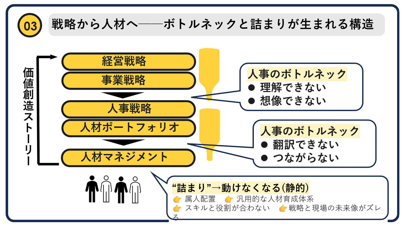 キャリアオーナーシップの推進には、構造的なボトルネックが存在します。一つは、経営戦略や事業戦略が、人事戦略にまで具体的に落とし込まれていないこと。あるいは、人事が経営・事業戦略を十分に理解できていないという「戦略の断絶」です。