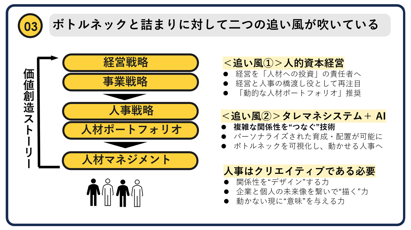 人材のポートフォリオというか、経営として、どういう人材が必要なのかっていうのを明確にする、これはAIでできるはずですよね。ただ、そのためには「やっぱり経営成果とは何か、成果を出せる人はどんな人か」の定義が合意できていないといけませんよね。
