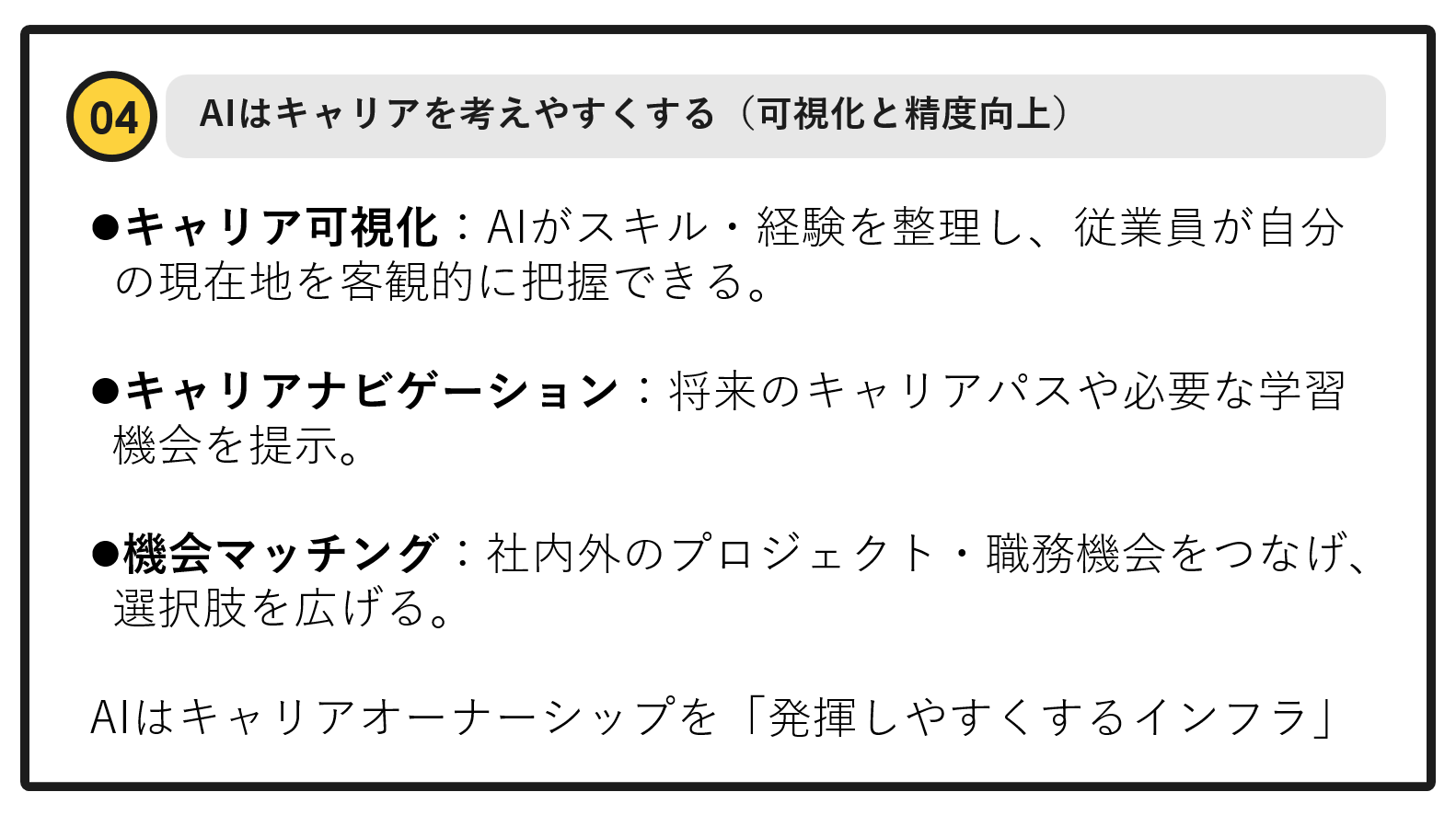 - AIの進化:社員一人ひとりに寄り添い、個別のキャリアを考えていくのは、人手だけでは限界があった。