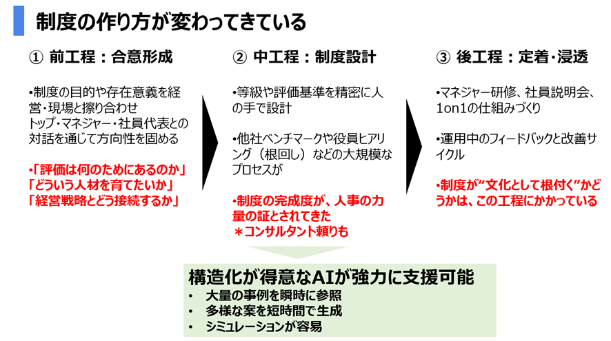 制度ができてから、合意形成をやろうとする。そうなると、非常に浸透が難しいのですよね。AIがあれば、その制度設計が内製できる可能性がある。今までは設計にお金と時間を投下していたのが、AIで工数を削減できます。そのぶんできた時間を、合意形成に使える。中小企業ではすでに、合意形成や運用に時間を割ける事例が出ています。