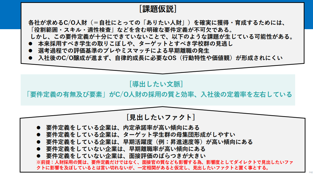 いい研究ですね。さらに具体性がほしいです。例えば「主体性」「やる気」「成長意欲が高い」といった言葉ではなく、「業務の振り返りができる」「目の前の仕事に対して意味づけをできる」といった言語化です。要は態度ではなく、行動特性で見る。