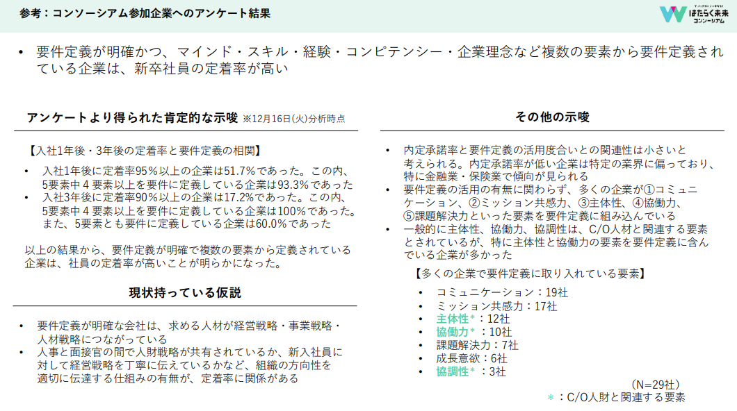 要件定義が明確で、コンピテンシー理念を含む複数の要素からキャリアオーナーシップ人材の要件定義がされている企業は、新入社員の定着率が高いことが見えてきました。特に多くの企業で、主体性・協働力・協調性が重視されていることがわかっています。
