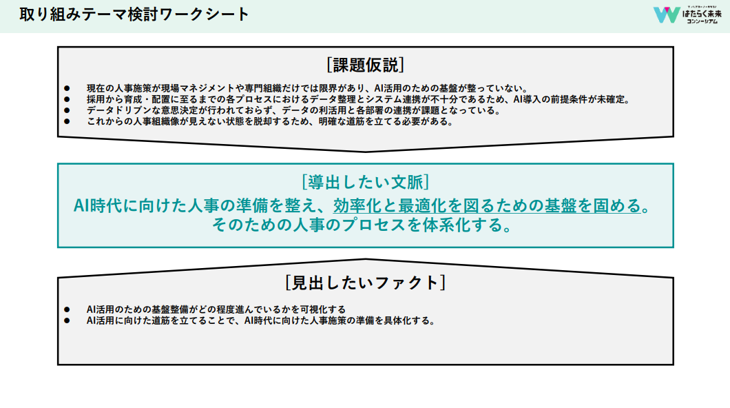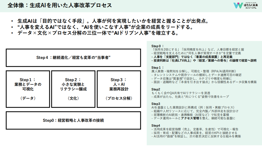 我々のテーマは「AI活用に備えて、人事はどう準備していくか」という話です。生成AIがこの世に出てきましたが、人事にどうやって活用したらいいのか。そして、今どういう立ち位置にいて、どういうステップでAIを活用していけばいいのか。さらに、キャリアオーナーシップ支援としてAIをいかに活用できるのか。