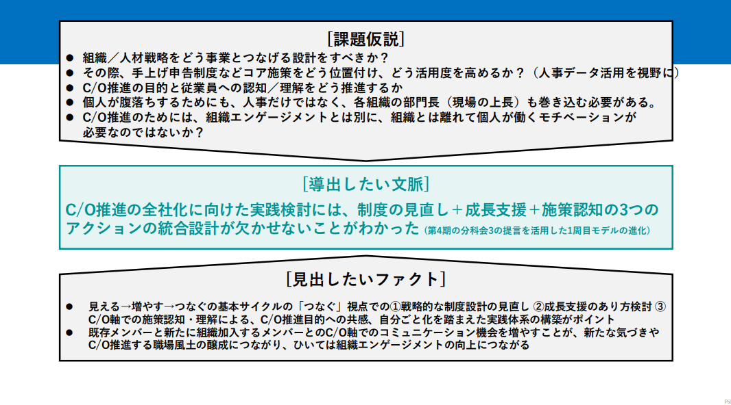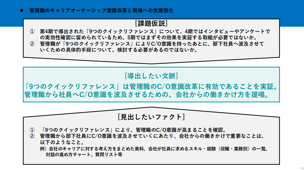 私たちは4期で検討しておりました、9つのクイックリファレンスの効果検証と、社員に対してキャリアオーナーシップ意識を普及させるために取れる施策の模索でした。これまでのご助言を踏まえ、9つ全てを査定するのではなく「マネジメント層が自身のキャリアについて考えるための施策」を最優先としました。