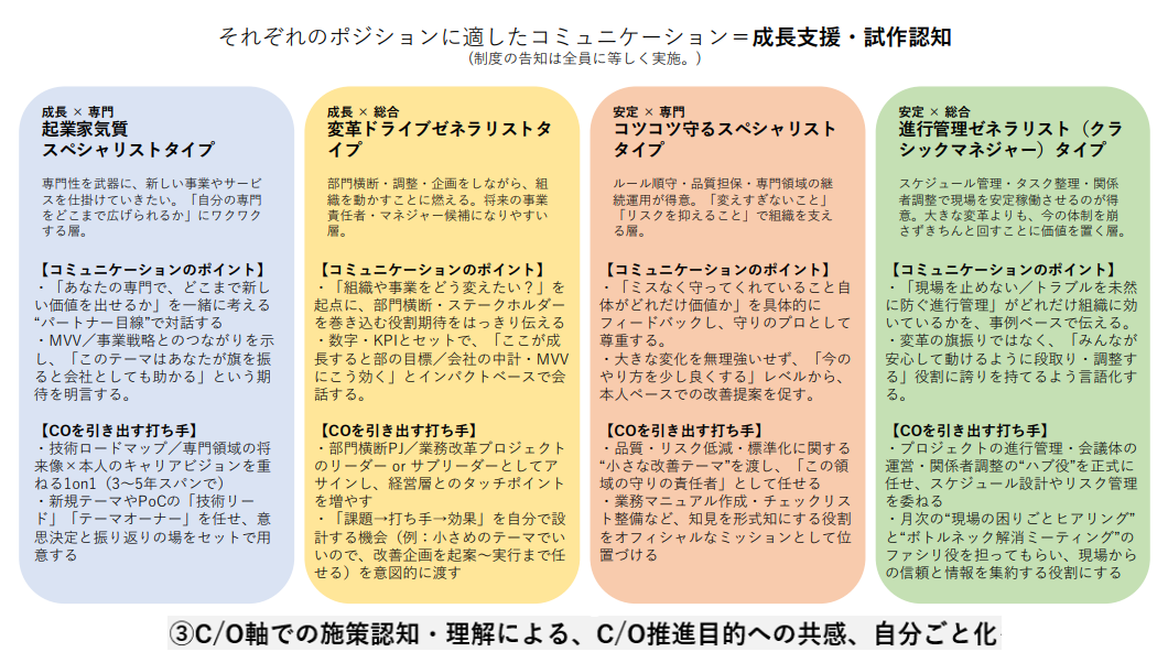 そこで社員を4象限に分けて、それぞれのポジションに適したコミュニケーションやガイドラインを型として作っていけないか、と取り組んでいます。