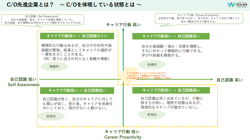 そのうえで、キャリアオーナーシップ先進企業の定義を我々の分科会の中でも言語をそろえるために、定義しようと考えました。そのうえで「自分の価値観・強み・目標を理解し、それに向かって積極的に行動できる」人材がキャリア自律的である、と考えています。
