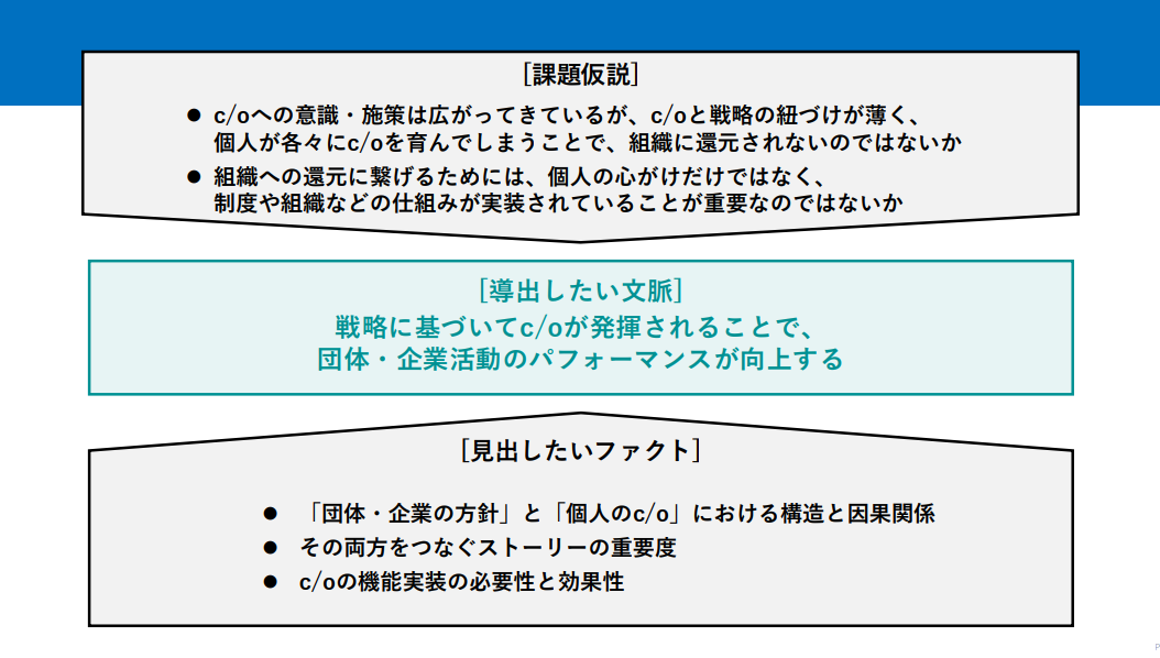 私たちが自社のキャリアオーナーシップの推進状況を見ると、概念や施策はたくさんあるのですが、なかなか浸透しきれていない部分があるのではないかと考えています。そういう現状を念頭に置きながら、今一度キャリアオーナーシップ1周目に何が必要なのかというところを、過去のコンソーシアムの知見を活かしつつ研究を進めていった次第です。
