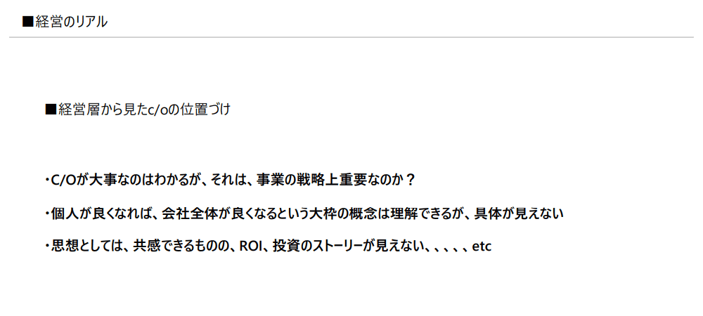 いいですね。さらに「何が・どう効くか」を説明できるとよいですね。例えば、2千5百人という母集団を調査されたとのことですが、そのなかで「何が」効いているかというところを説明しうると、経営者が納得しやすいでしょう。「費用投資効果ってあるの?」という部分から、経営層は疑問視しているケースもあるでしょうから。