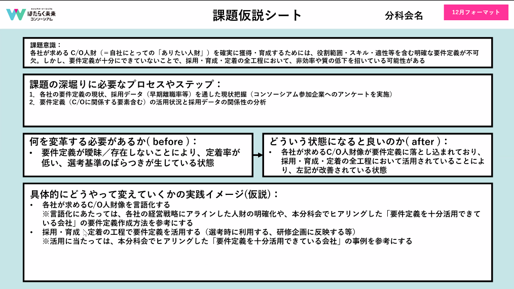 そこで、各社で採用基準の要件定義があるのかどうかを調査しています。選考基準の要件定義ができていないことから、人材の定着率が低い状態を避けたい狙いです。そのためにも、キャリアオーナーシップ人材を言語化し、採用の要件定義に落とし込んだうえで採用・育成・定着に活用される状態を目指したいと考えました。