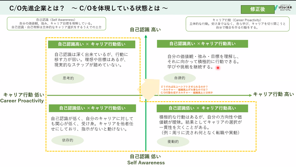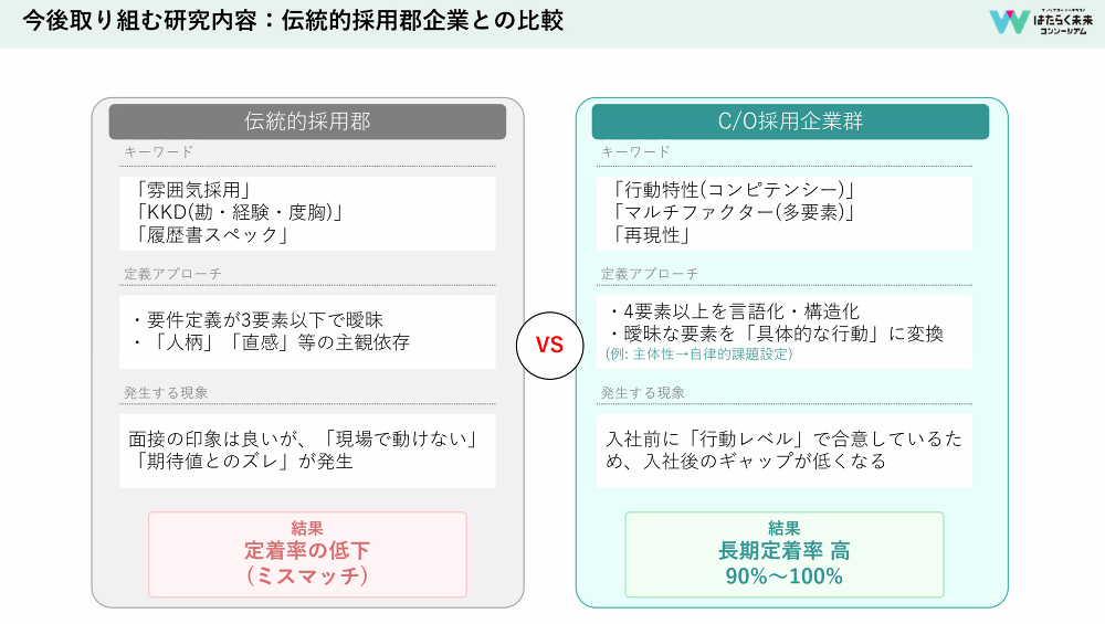 そして、タナケン先生のアドバイスをもとに伝統的な採用を志す企業と、キャリアオーナーシップ人材を採用した企業の差を行動特性まで落とし込んで比較できるようにしたいと考えています。