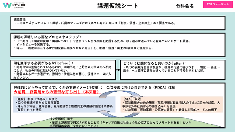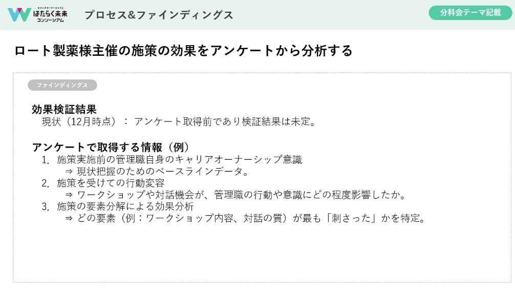 具体的には、昨年度の参画企業である三井情報さんのお力をいただき、ヒアリング調査を実施しています。そして、打ち手のうちの2つにある「管理職向けキャリア形成ワークショップ」「キャリアについて話し合う機会の設定」をロート製薬株式会社さんで実施していただき、効果検証を行っていく流れです。