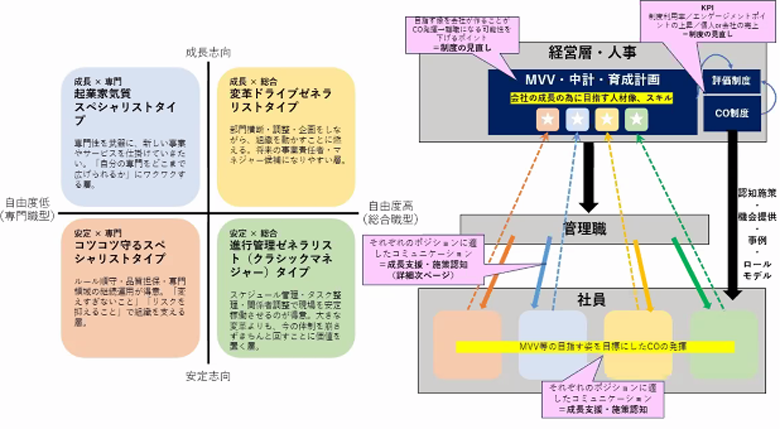 また、いまおっしゃったとおりキャリアオーナーシップというと、華々しいキャリアを描ける人が立派であるという思想が出てきますが、そんなことはありませんよね。その人の価値観と特性で描かれるキャリアは変わるはずです。「キャリアオーナーシップを持たせると転職しちゃうじゃないか」とおっしゃる方は、そういう誤解をしているケースが多い。コツコツ守るスペシャリストタイプも、キャリアオーナーシップを持つし目標を持っていいわけで。