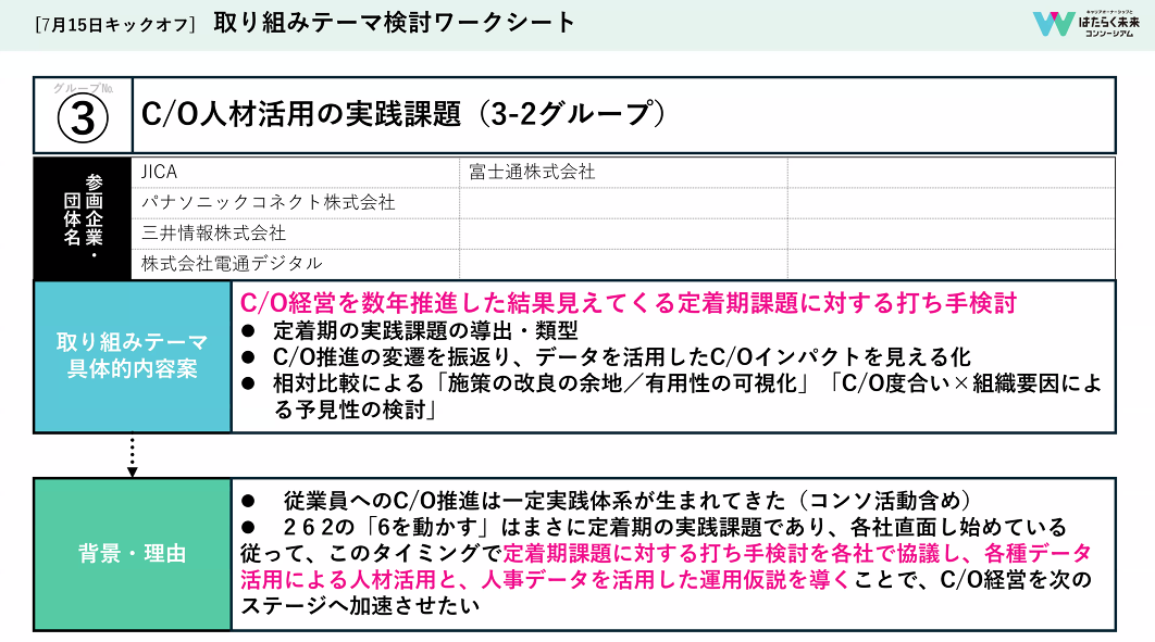 私たちは、キャリアオーナーシップを数年推進した後「2周目の課題」に向き合って議論しました。いわゆる2:6:2のうち「6割の人を動かす」にはどうすればいいのか。その打ち手を各社で議論し、キャリアオーナーシップ経営を次のステージへ加速させたい狙いです。