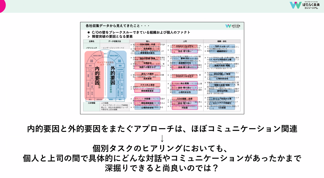 たとえば、工場や営業所などを多く抱える企業では、マニュアルが優先されてキャリアオーナーシップ人材の重要性が行動にまで及ばないことが多々あります。また、キャリアオーナーシップ支援施策が個人に向けられすぎており、制度として運用・浸透できていないのではないかといった課題についても明らかとなりました。