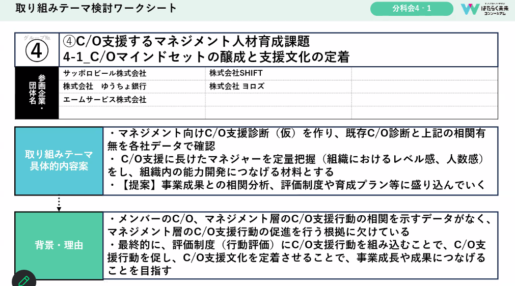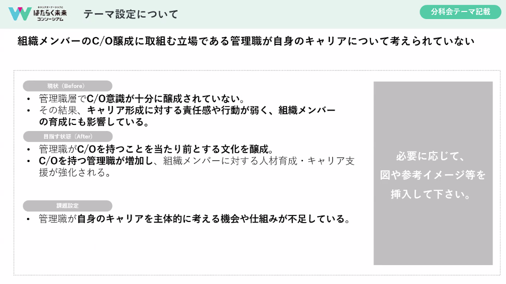 単純にキャリアオーナーシップを上げるというだけでなく、新たな問題提起に分科会の活動がつながればと思います。ぜひ、役員をうならせてください。