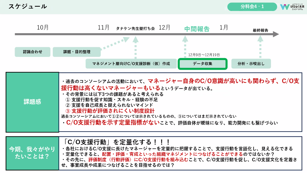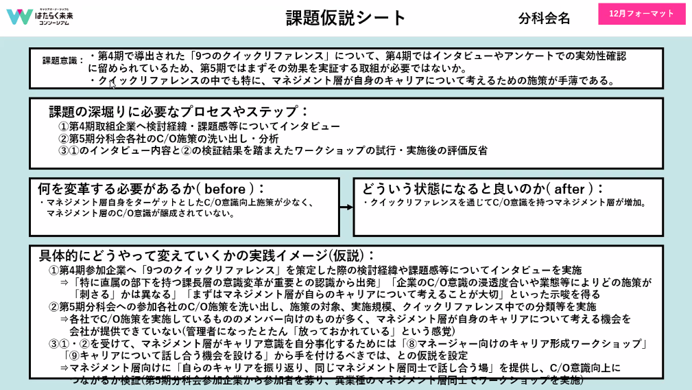 私たちは、第4期で提唱された9つのクイックリファレンスの効果検証と、管理職からメンバーへキャリアオーナーシップ意識を波及させるための会社からの支援を考えています。
