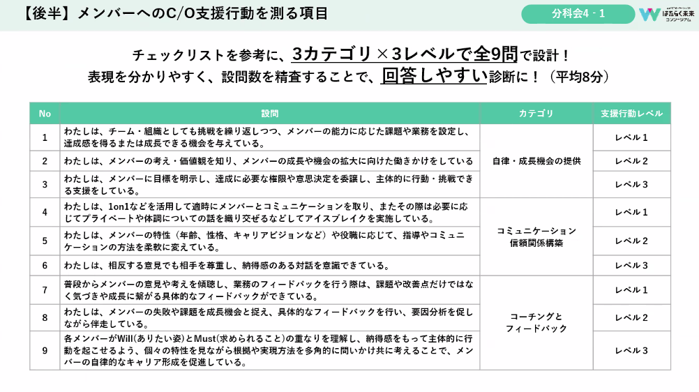 マネージャーが部下のキャリアオーナーシップを支援できているかどうかは、自己判断ということですね。360度評価にするなど、周囲からの評価にすべきと思いますが、いかがでしょうか。