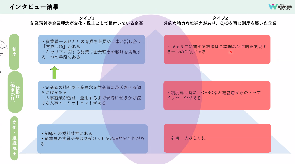 タイプで分けて分析するのもいいですが、YES/NOで答えられる問いを作って、診断できるといいかもしれませんね。「言うは易し」かもしれませんが。キーポイントを5つくらい見つけられれば、アウトプットの形は変えられると思いますので、まずはインタビューを通じて、キャリアオーナーシップを醸成する文化の鍵になるものがいくつか取り出せるといいですね。