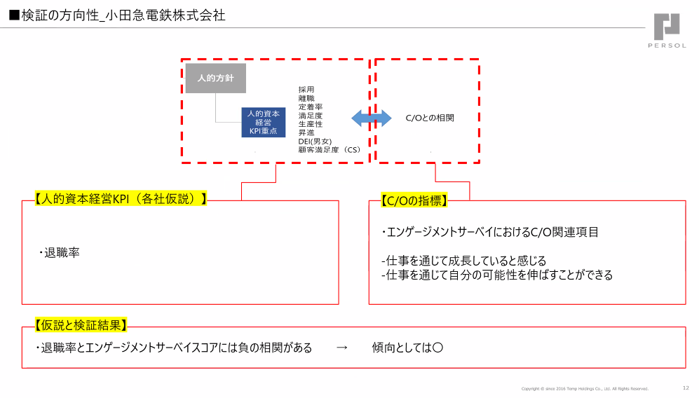 人的資本経営を進めるうえでのKPIで最も重要なのは退職率であろうと考え、キャリアオーナーシップとの連動性を見ていきたいと考えています。キャリアオーナーシップの指標としては、エンゲージメントサーベイの中のキャリアオーナーシップに関する項目を抽出しました。検証結果としては、エンゲージメントサーベイのキャリアオーナーシップに関するスコアと、退職率には負の相関があることがわかっています。