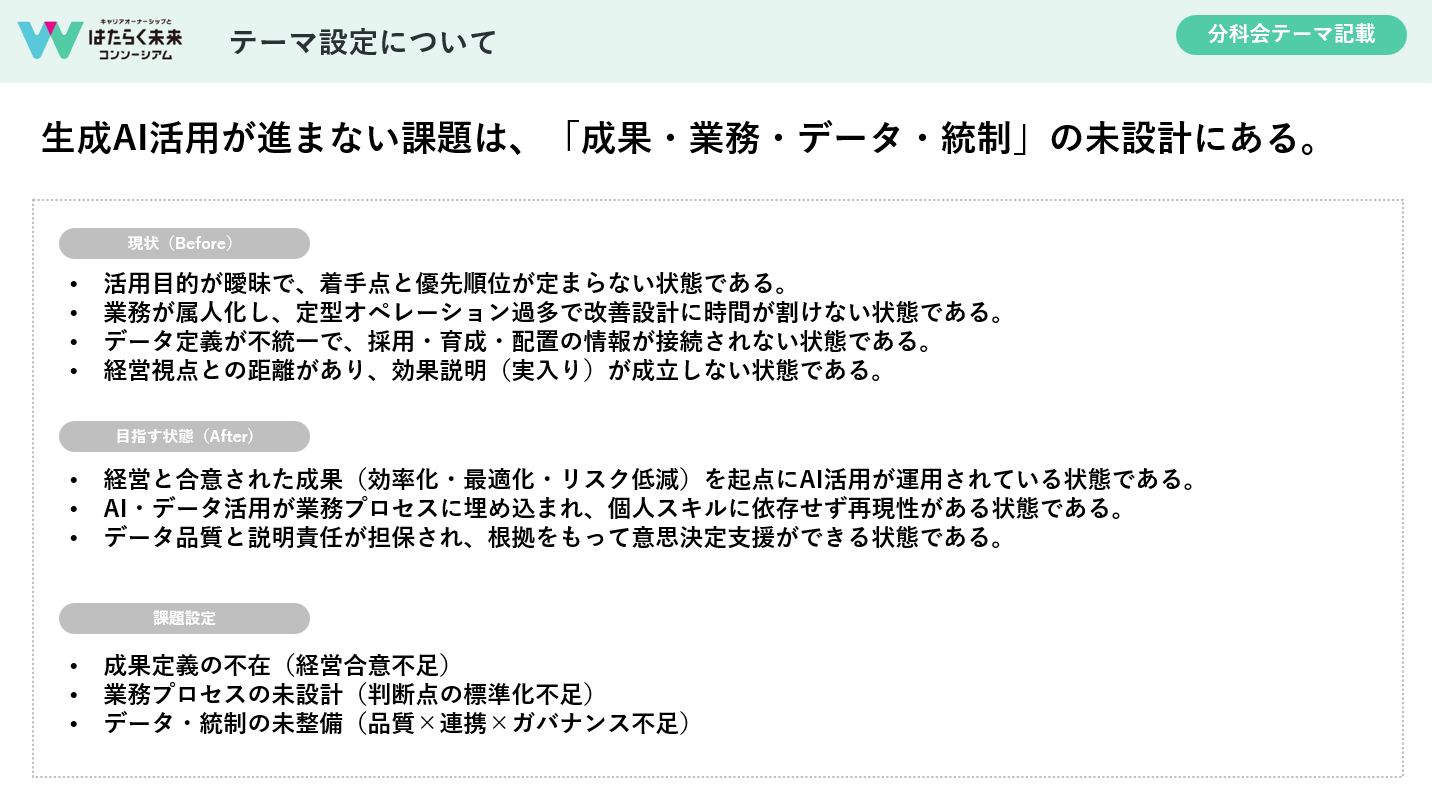私たちは、分科会全体で唯一AIをテーマにしたグループとして議論しています。生成AIの活用については、目的ではなく活用する手段です。そのうえで、活用目的があいまいであるために、属人化した業務に活用する道筋が立てられない状態にあるかと思います。