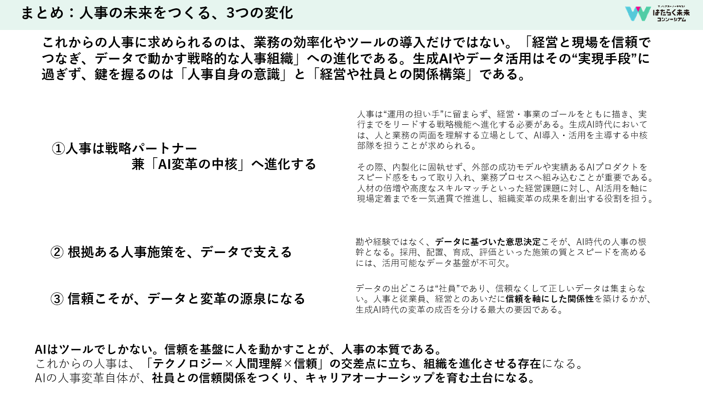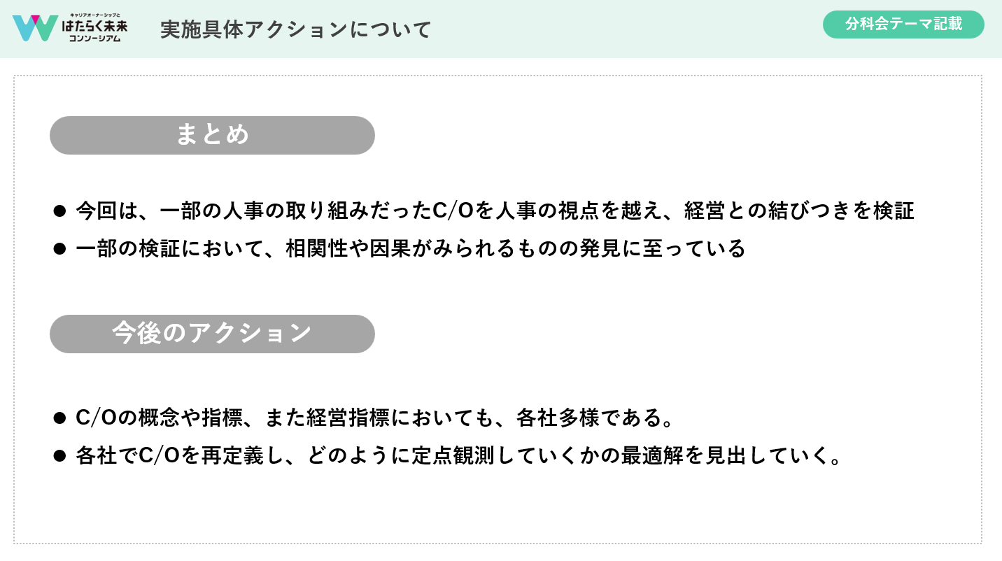 まとめとしては、各社でキャリアオーナーシップを再定義し、経営との結びつきを検証するのが重要であると確認できました。