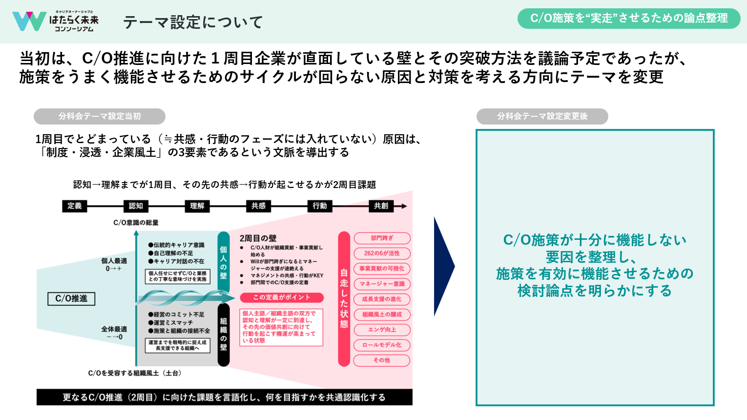 当初はキャリアオーナーシップ推進に向けた一周目企業が直面する壁について取り扱う予定でしたが、その後、施策が回らない壁と、実装させるための対策を考える方向へテーマを変更いたしました。