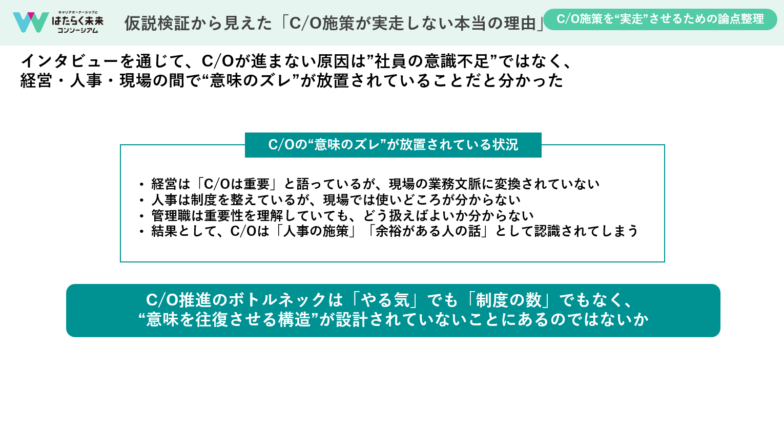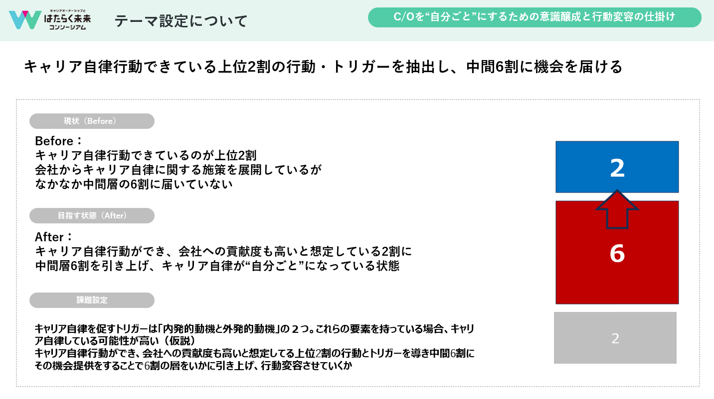 そのうえで「キャリアオーナーシップを醸成する文化がないのではないか」と「画一化されたアプローチに終始しており、個々人に分けたアプローチができていないのではないか」という仮説を立てて研究を進めました。