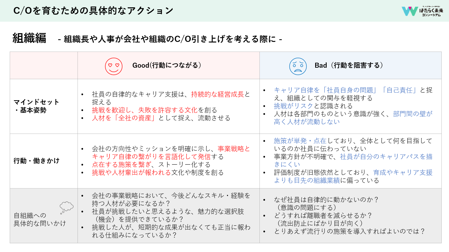 ―とても分かりやすいプレゼンをありがとうございます。組織・上司・個人が相まって初めて行動が起きるというのは、非常にキャッチーであり、同時にその通りだと思いました。さらに分析だけでなく、どういったアクションを起こすべきかを明確にしていただけたので、「やらなくてはならない」から「どうすればいいか」が具体化されたかと思います。