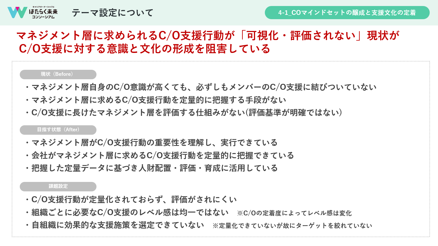 今回、私たちはマネジメント層のキャリアオーナーシップ支援行動が可視化・支援されない状態をいかに打破するかについて議論しました。個人がキャリアオーナーシップを高めても、それが必ずしもメンバーのキャリアオーナーシップ支援につながらない、あるいはマネジメント層のキャリアオーナーシップ支援行動を測定・評価する仕組みがないといった課題を持つ企業が多くあったかと思います。