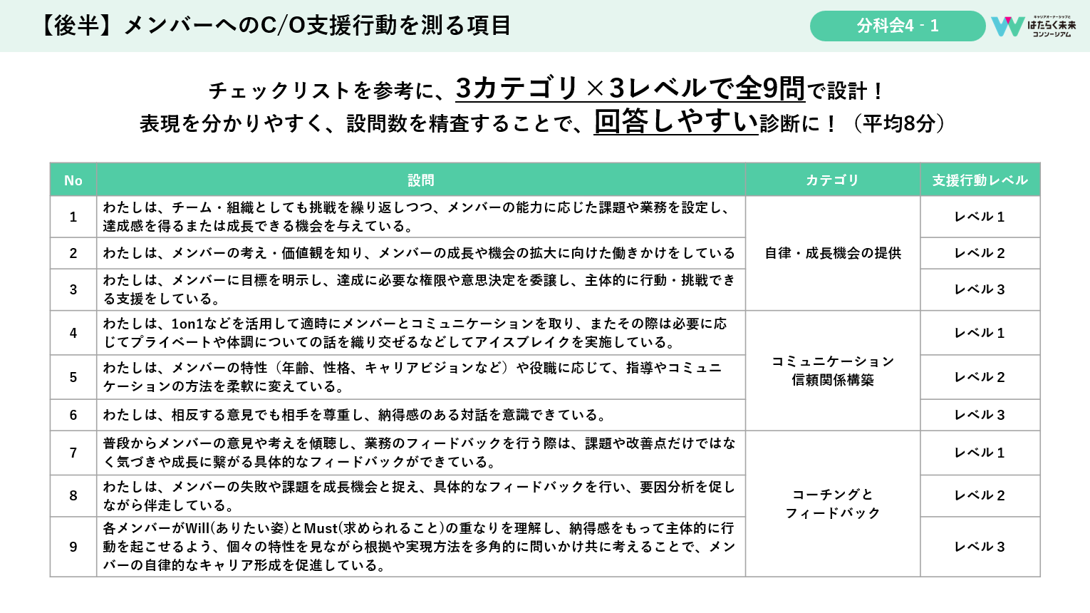 そこで、私たちは個人のキャリアオーナーシップ意識と支援行動の相関分析を実施しました。まずはマネジメント層のキャリアオーナーシップ支援行動を定量化する狙いです。上図が実際に行った9つの設問です。