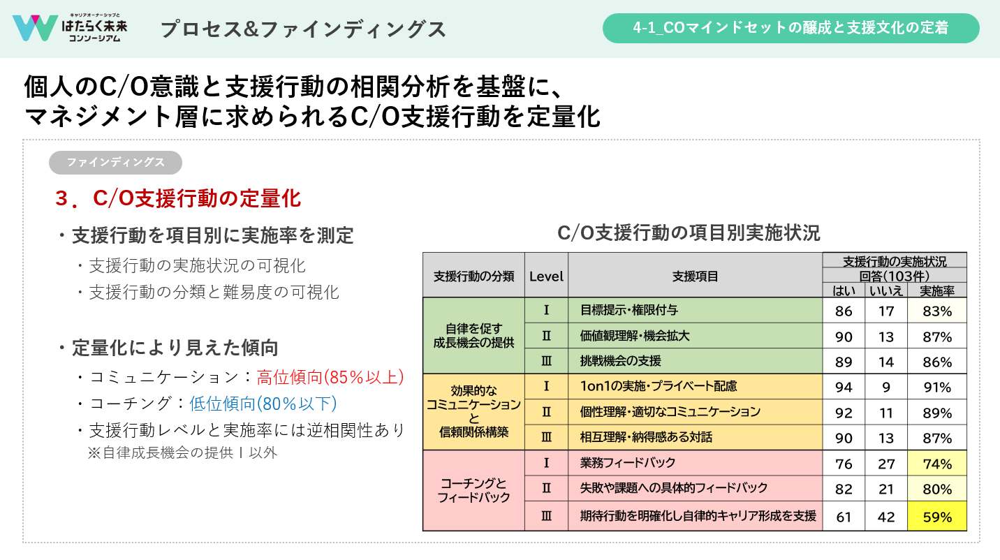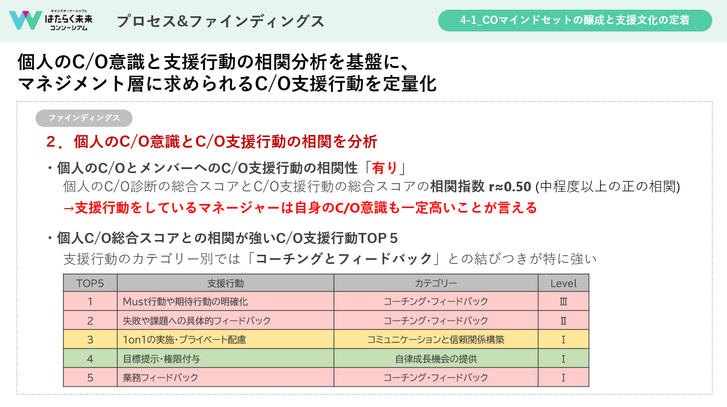 結果としては、個人のキャリアオーナーシップ意識とキャリアオーナーシップ支援行動には正の相関がありました。特に、コーチングとフィードバックのカテゴリにおいて、マネジメント層はメンバーへキャリアオーナーシップ支援行動を行っていることが判明しています。