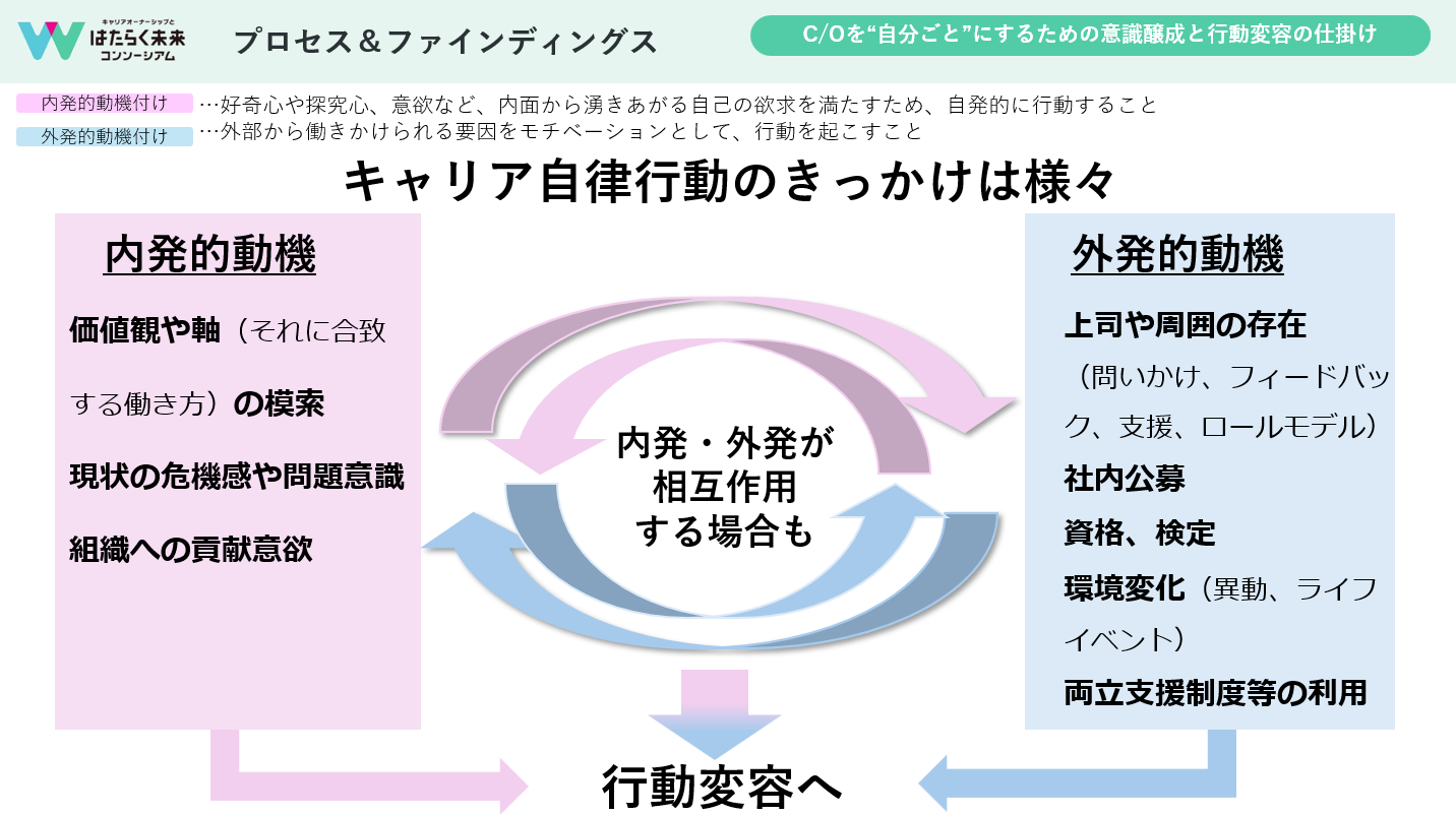 そこでトップ2割の層にフォーカスし、研究を進めました。結果、言葉の定義をやり直して「内発的動機・外発的動機」というフレーズに収束したわけです。そのうえで、どういった因果関係が双方にあるのか、インタビューを通じて深掘りしていきました。