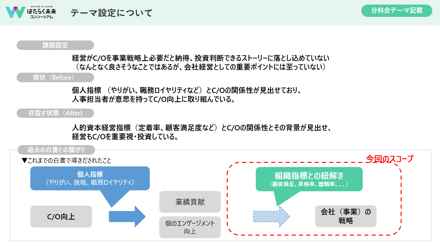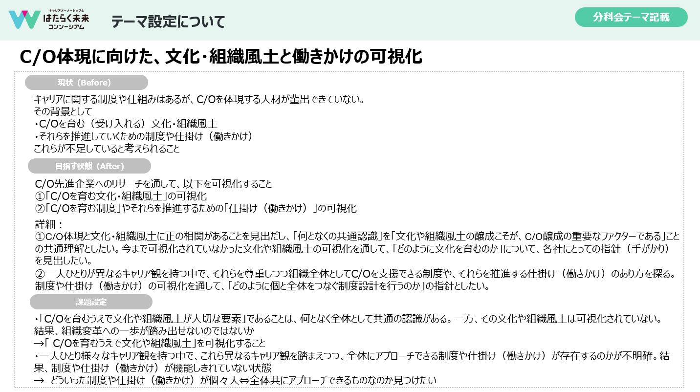私たちは、別々の分科会であったところを合同で研究することになりました。5-2は組織風土・文化を、5-3ははたらき方・仕掛けについて研究しています。私たちの共通課題として、キャリア制度はあっても、キャリアオーナーシップ人材の輩出ができていないというものがありました。