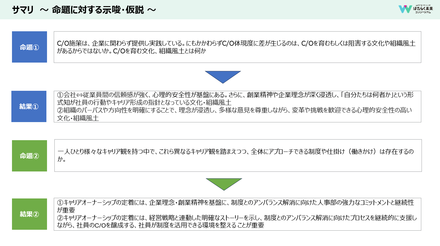 結論として、企業文化が根付いているところは暗黙知となっている理念を言語化しようと試みており、その結果としてキャリアオーナーシップを育んでいることが分かりました。逆に、創始者の強い思いがない企業では、社員全員で「自社文化とは何だろう」と話し合うプロセスなどを経て、キャリアオーナーシップを推進していることが分かりました。
